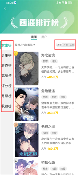 3、在【排行】板塊可以看到各個(gè)不同榜單的漫畫排行,可以選擇切換周榜/月榜/總榜進(jìn)行選擇,不知道看什么,點(diǎn)擊排行榜,看大家都在看什么,跟著走準(zhǔn)沒錯(cuò);