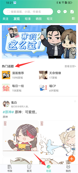 4、點(diǎn)擊【社區(qū)】板塊,有超多漫友在線分享自己喜歡的漫畫以及追漫感想等,還有豐富的熱門話題等著大家參與討論。