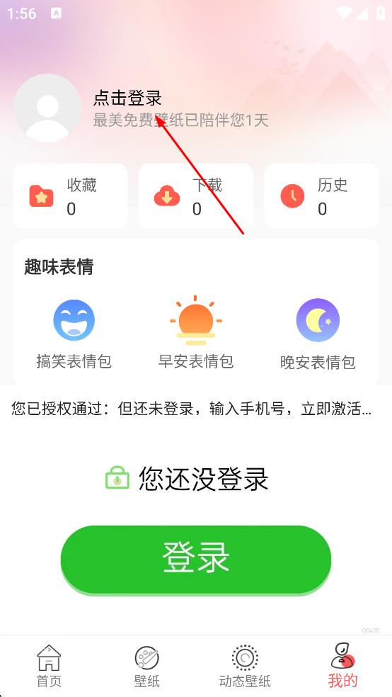 1、打開壁紙軟件,進(jìn)入主界面后,點擊底部“我的”選項,進(jìn)入個人中心頁面,在頁面上方找到“點擊登錄”區(qū)域。