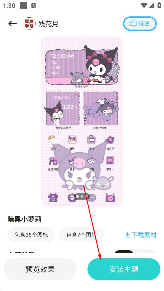 3、在主題詳情頁,點擊“安裝主題”按鈕,等待安裝完成,即可將該主題應(yīng)用到手機(jī),更換界面樣式。