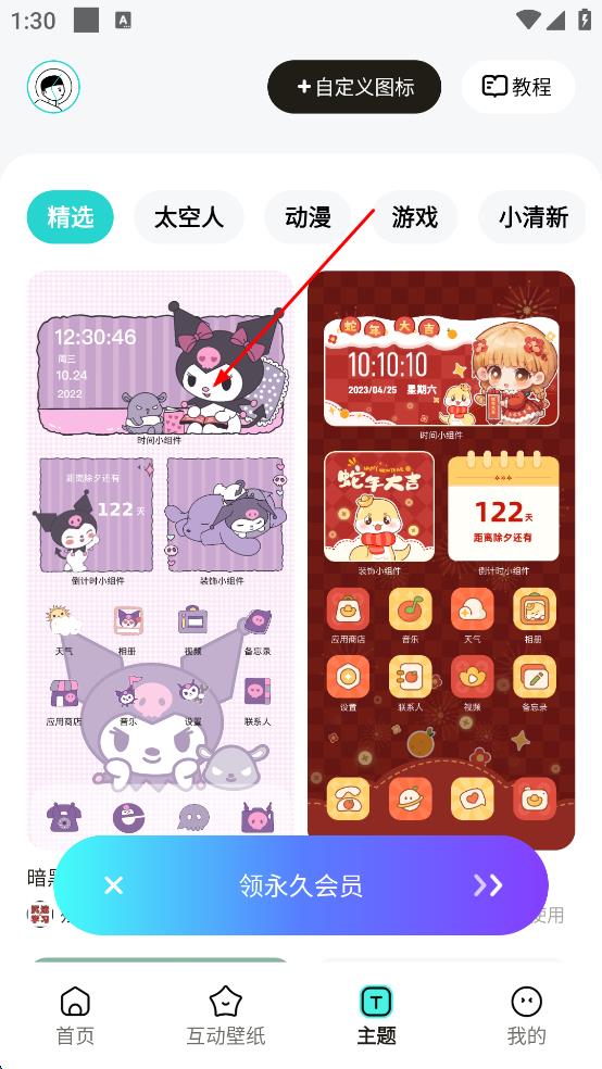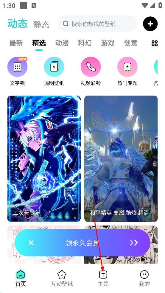 1、打開壁紙軟件,在首頁點擊底部“主題”選項,切換到主題頁面,瀏覽各類主題內(nèi)容,尋找喜歡的風(fēng)格。