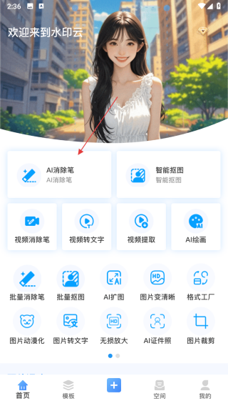 1、打開水印云APP,在首頁點擊AI消除筆功能,進入AI消除筆操作頁面。