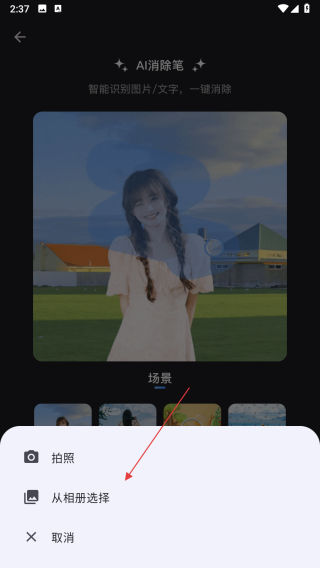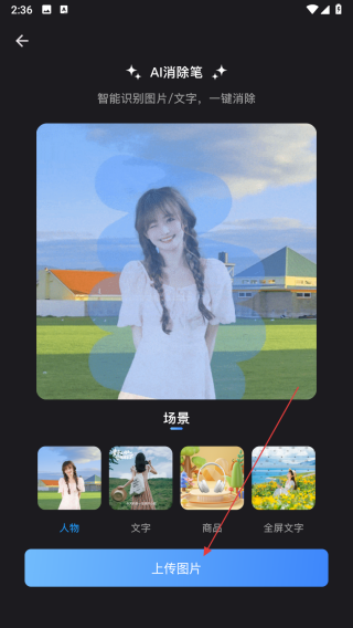 2、在AI消除筆頁面,點擊上傳圖片按鈕,彈出圖片選擇方式選項。