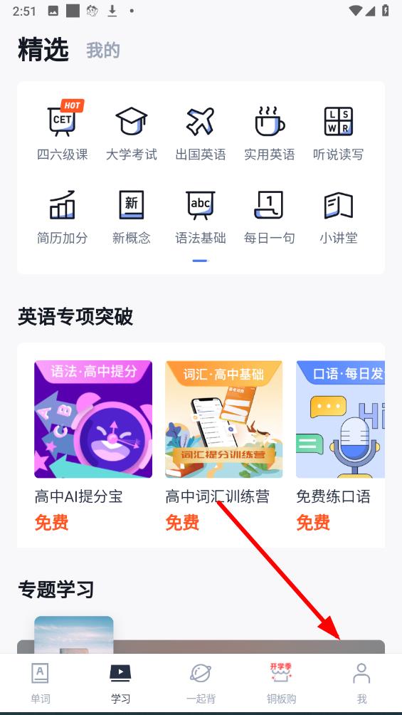1、打開百詞斬軟件在底部導(dǎo)航欄中,點擊最右側(cè)的我選項,進入個人相關(guān)界面。