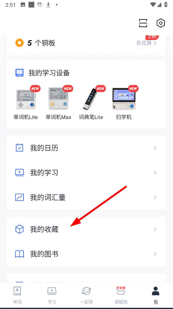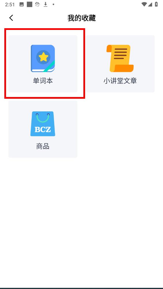 3、進入我的收藏頁面后,會看到不同類別的收藏選項,點擊單詞本圖標,就能查看你在百詞斬中收藏的單詞,方便隨時復(fù)習(xí)鞏固。