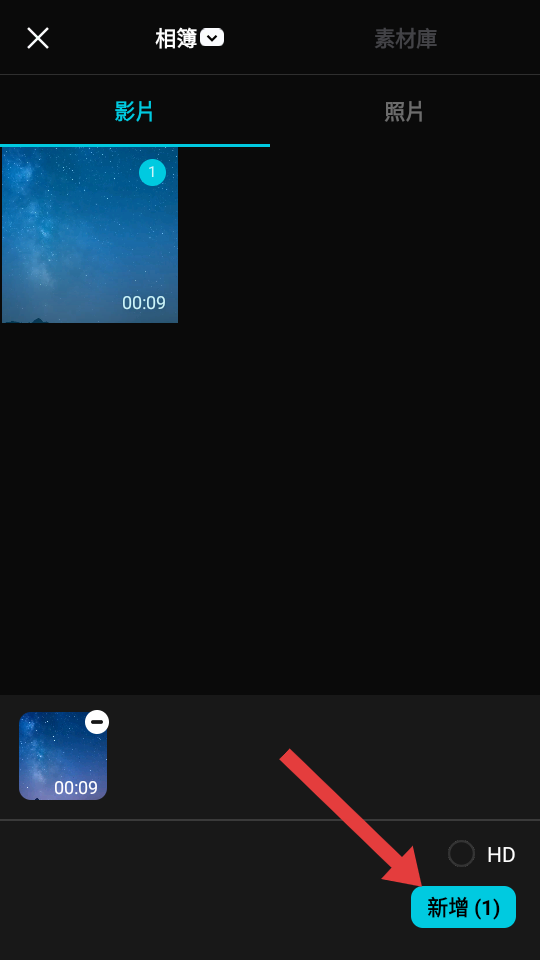 2、在相簿的影片標簽下,選擇要導出的視頻素材,點擊右下角新增按鈕。