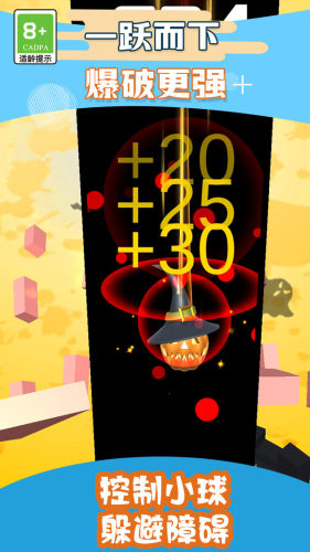 1、玩家可以通過(guò)滑動(dòng)屏幕隨意控制彈球方向和自己的跳躍力度,使彈球從塔頂跳到相對(duì)應(yīng)的塔底;