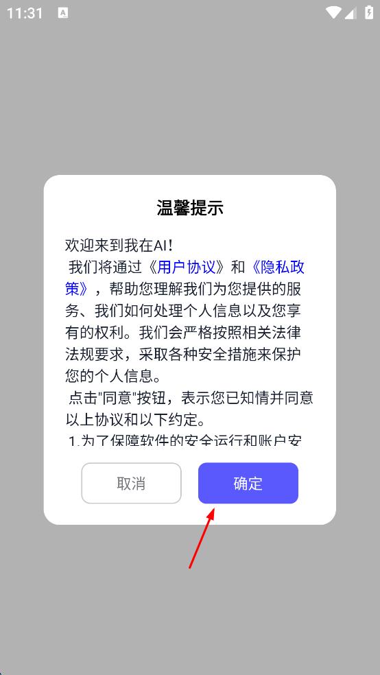 1、打開我在AI APP,會彈出溫馨提示彈窗,仔細閱讀相關內容后,點擊“確定”,進入登錄相關頁面。