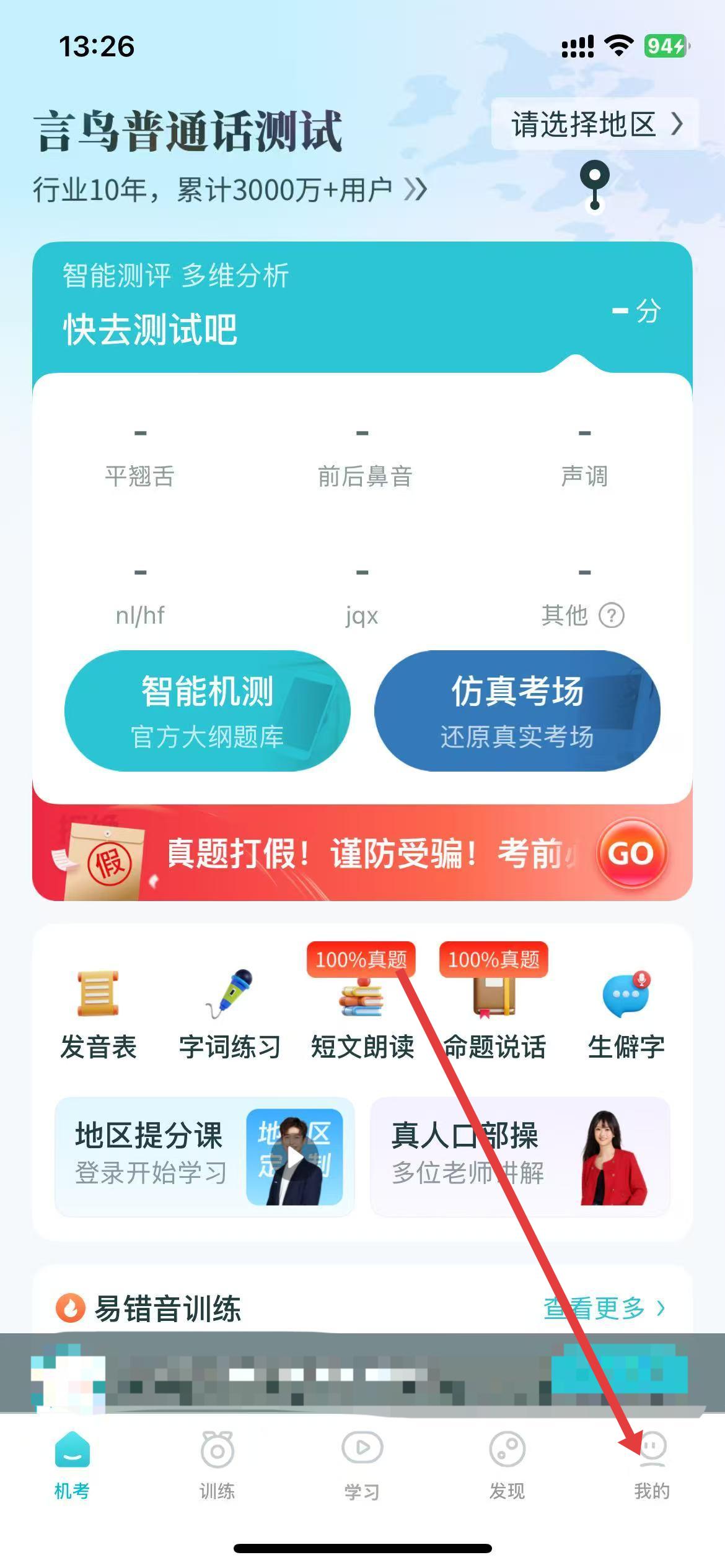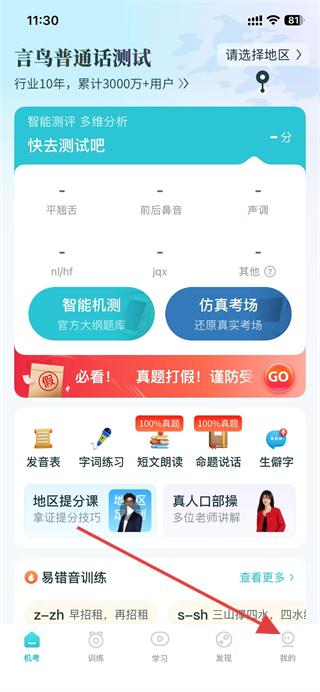 1、打開(kāi)普通話測(cè)試,點(diǎn)擊底部導(dǎo)航欄我的。