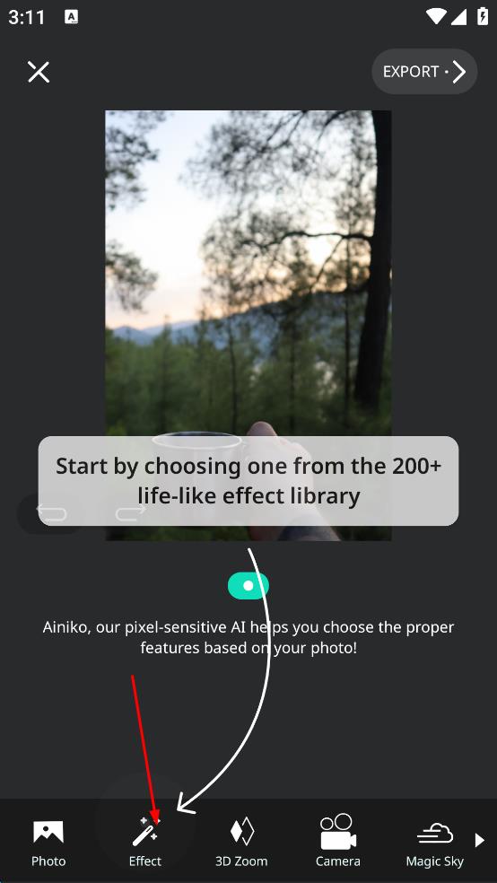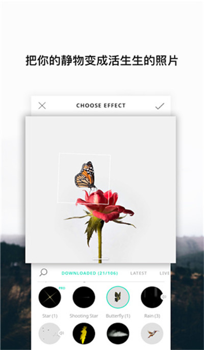 2、在編輯頁,點擊底部“Effect”,進入特效庫,挑選合適動態(tài)特效,為照片添加效果。