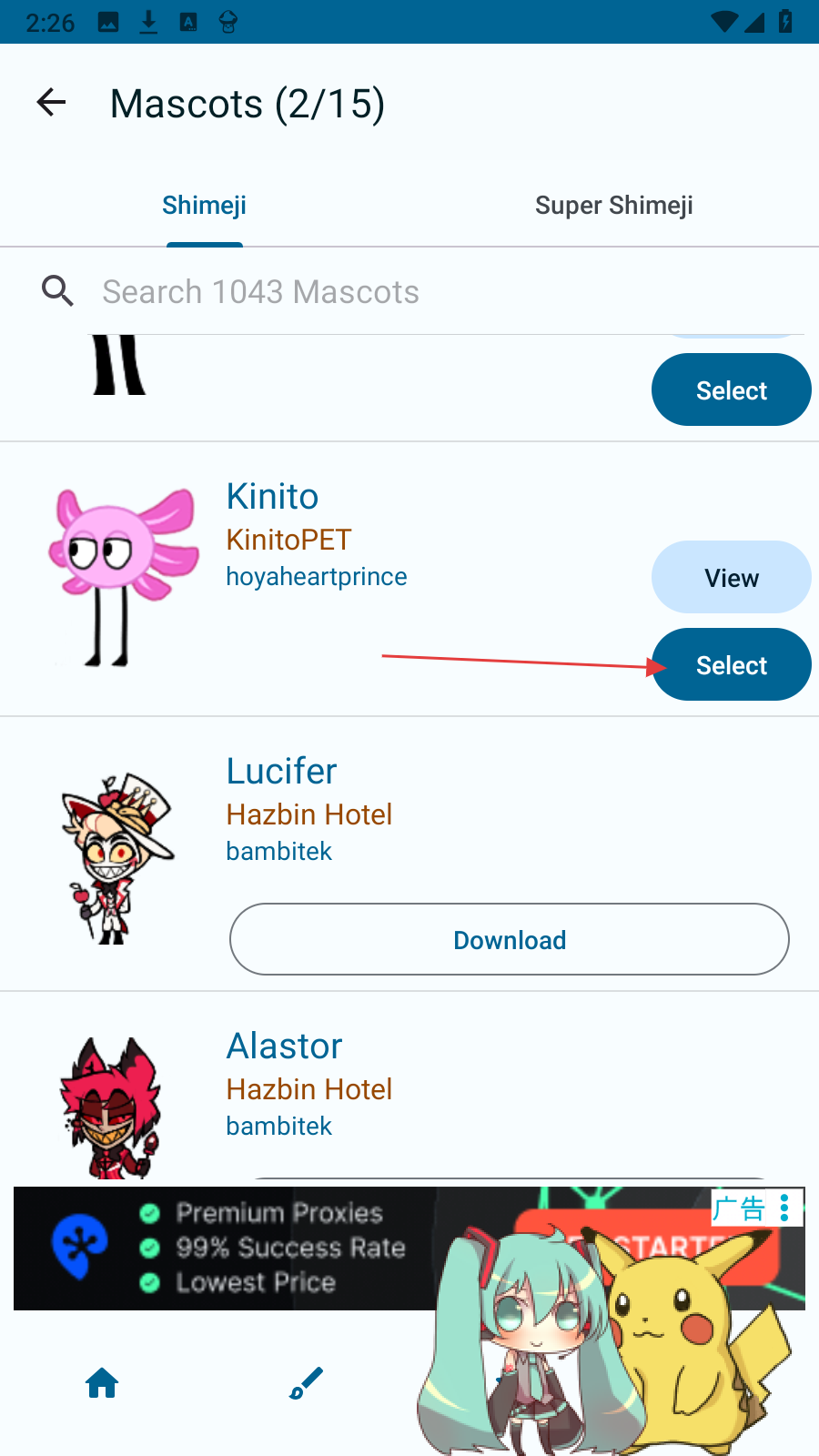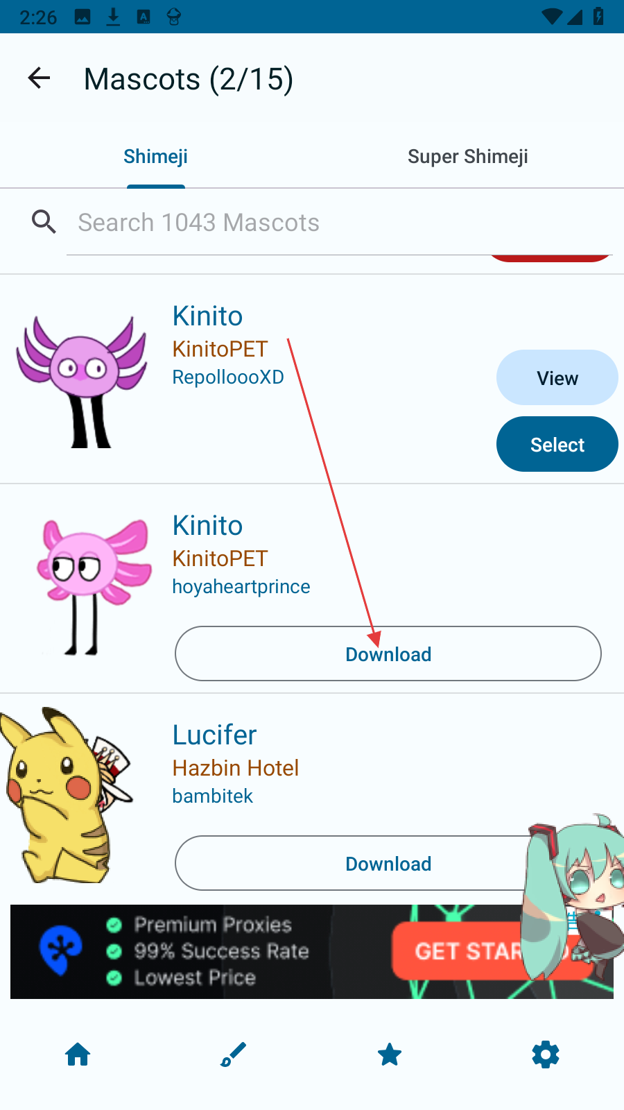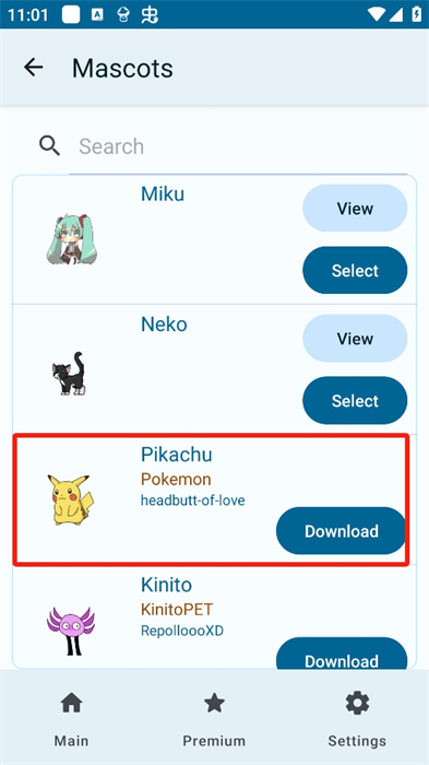 1、打開Shimeji應(yīng)用進入Mascots界面,在眾多角色列表中找到想下載的角色,找到后點擊該角色下方的Download按鈕開始下載,等待下載完成。