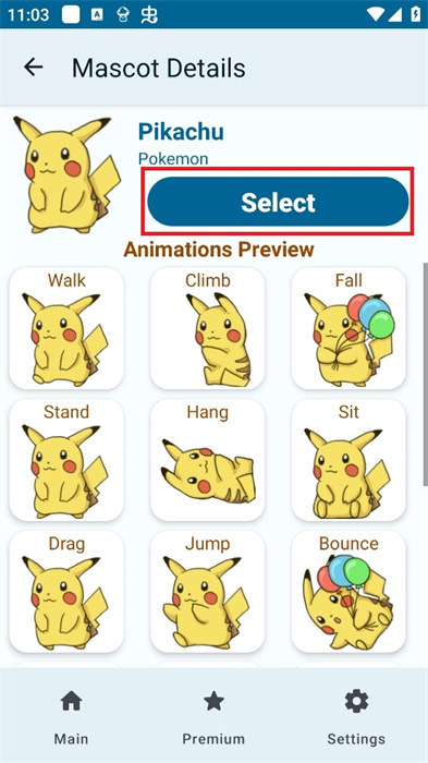 6、選擇好自己喜歡的桌寵動作之后,就可以點擊【Select】選擇該桌寵顯示在手機屏幕上。