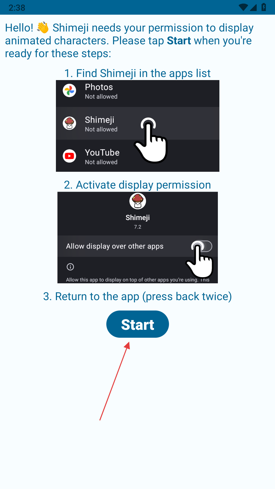 1、打開(kāi)Shimeji應(yīng)用彈出權(quán)限請(qǐng)求界面,按提示在手機(jī)應(yīng)用列表找到Shimeji,點(diǎn)擊開(kāi)啟權(quán)限按鈕。進(jìn)入手機(jī)設(shè)置的顯示權(quán)限頁(yè)面。