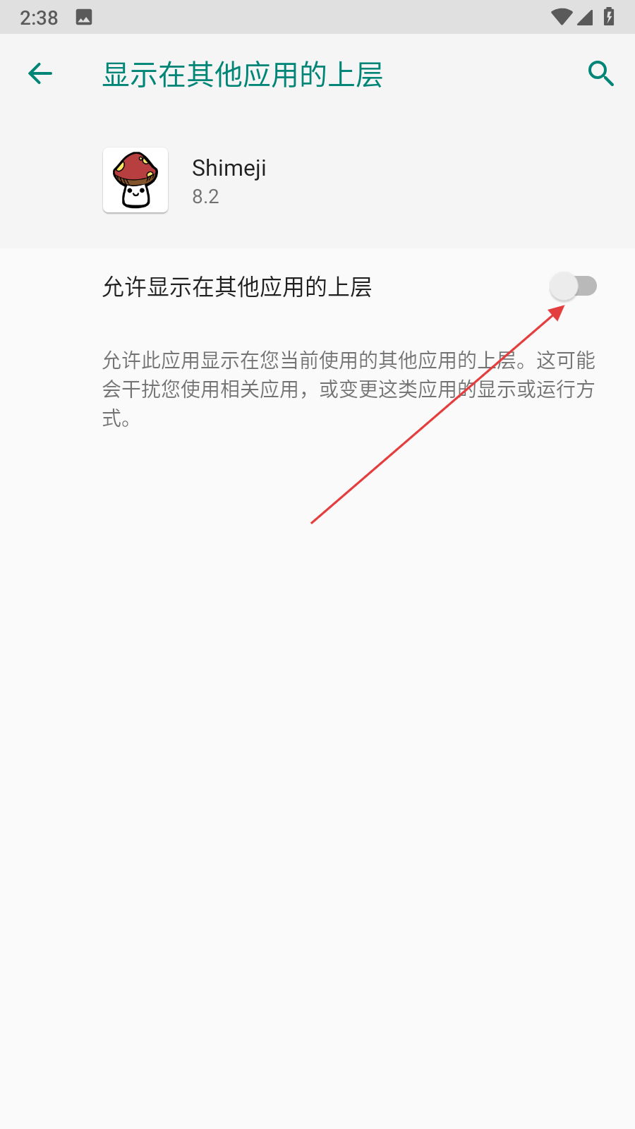 2、進(jìn)入手機(jī)設(shè)置的顯示權(quán)限頁(yè)面,打開(kāi)允許Shimeji顯示在其他應(yīng)用上層的開(kāi)關(guān)。