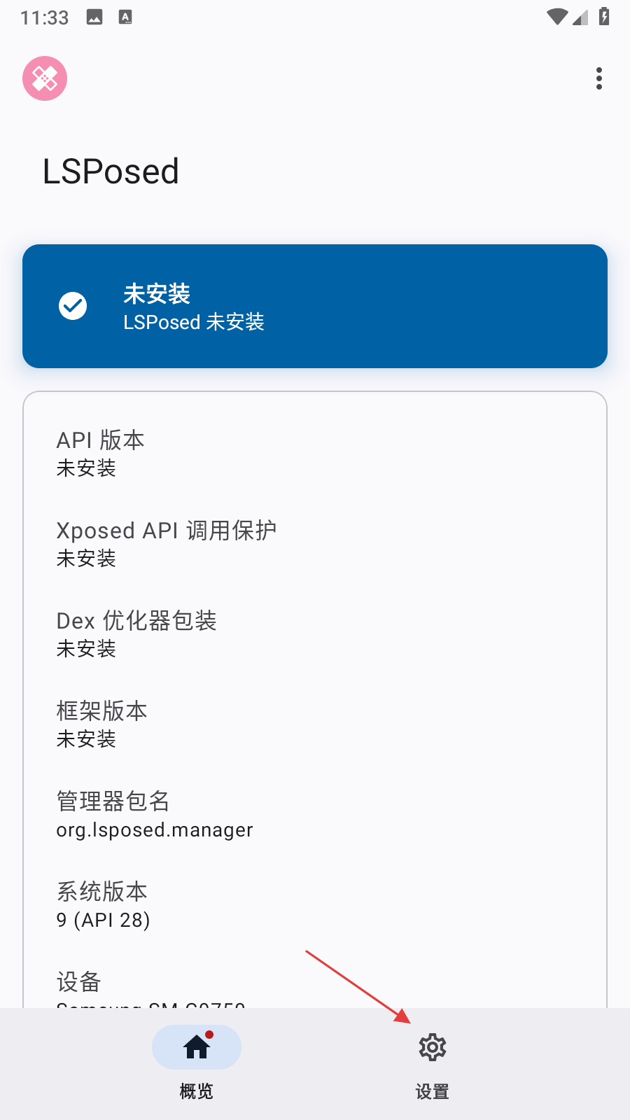 1、打開LSPosed應(yīng)用,點擊主界面底部的設(shè)置,進入設(shè)置頁面。