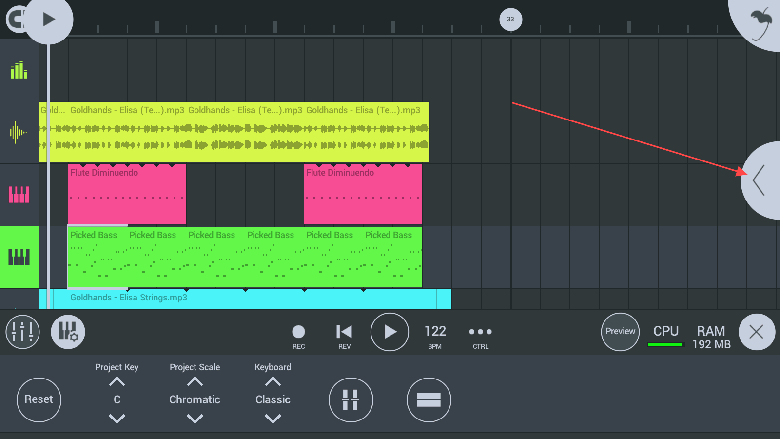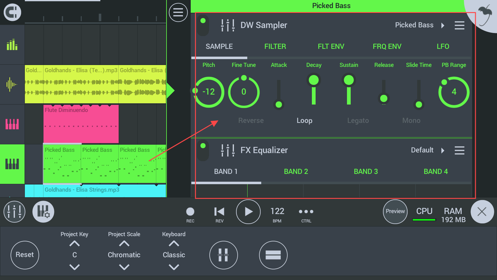 1、打開FL Studio Mobile軟件進入音頻編輯界面,點擊界面右側(cè)的箭頭圖標(biāo),展開音頻編輯的詳細參數(shù)設(shè)置區(qū)域,可看到DW Sampler、FX Equalizer等模塊,方便對音頻進行細致調(diào)整。