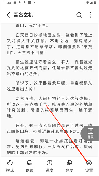 2、進(jìn)入閱讀界面后,點(diǎn)擊任意一處,在打開的功能選項(xiàng)中選擇右下角的設(shè)置;