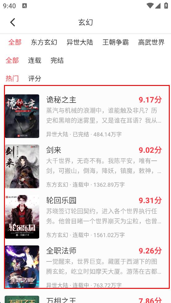 4、在玄幻小說列表頁面,可瀏覽眾多玄幻小說,如《詭秘之主》《劍來》等,根據(jù)需求選擇想要閱讀的小說。