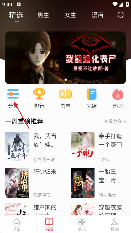 2、在書城頁面,點(diǎn)擊“分類”選項(xiàng),進(jìn)入小說分類頁面。