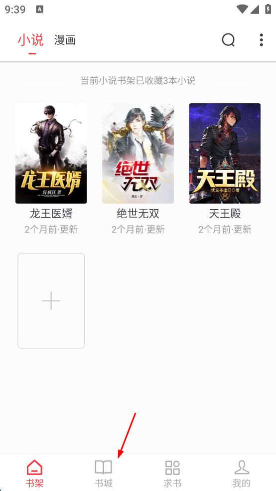 1、打開小說閱讀類APP,進(jìn)入首頁后,點(diǎn)擊底部“書城”圖標(biāo),進(jìn)入書城頁面。