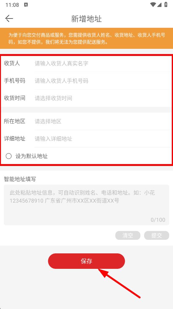 4、在新增地址頁面,依次填寫收貨人姓名、手機(jī)號碼、收貨時間、所在地區(qū)、詳細(xì)地址等信息,點(diǎn)擊保存,即可完成地址信息添加。