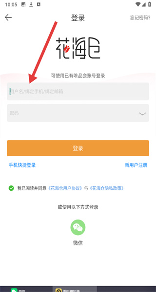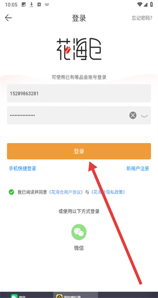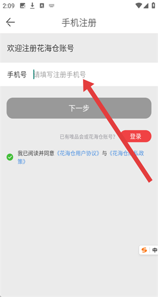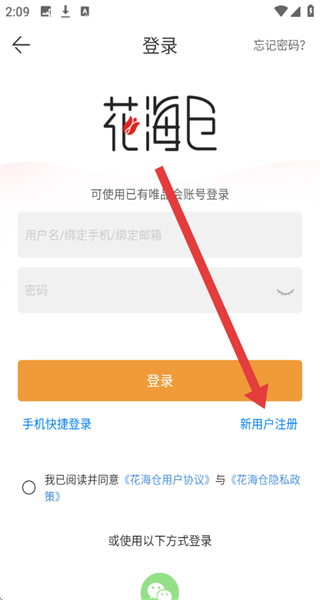 2、在花海倉APP登錄頁面點(diǎn)擊“新用戶注冊”,進(jìn)入手機(jī)注冊界面。
