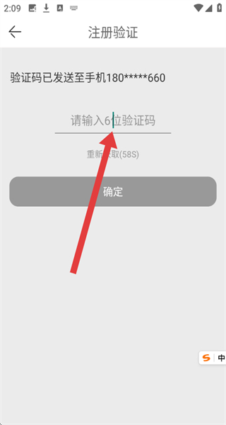4、進(jìn)入注冊驗(yàn)證界面,輸入收到的6位驗(yàn)證碼,完成賬號注冊操作。