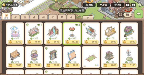點擊“多選”按鈕,可以選中多個裝飾集體移動,甚至連地磚也可以一并轉(zhuǎn)移,非常適合范圍布局。旁邊的“消除”按鈕,可以將多個裝飾合并消除,一步到位的便利操作。