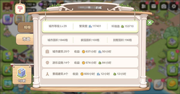城建裝飾來源于等級樹的繁榮線任務(wù),包括基建設(shè)施、游樂設(shè)施和景觀。竣工結(jié)束的基建設(shè)施每小時會產(chǎn)出金幣和繁榮度,竣工結(jié)束的游樂設(shè)施每小時會產(chǎn)出金幣和環(huán)境值,景觀每小時產(chǎn)出金幣、環(huán)境值與繁榮度,三者收納后也不會影響產(chǎn)出。