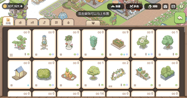 ⑥抹涂,比復(fù)制更快捷,適合圍欄放置、鋪設(shè)花草,輕輕劃過就能在指定位置放置相同裝飾,在抹涂過程中可以點擊左下角挪屏移動屏幕