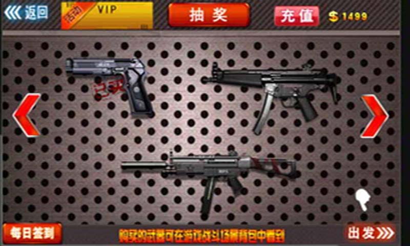 1、獲取的金幣可以購買全新的武器,點(diǎn)擊武器界面可以更換不同的武器戰(zhàn)斗;