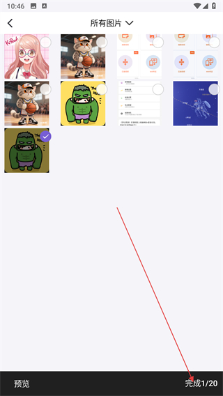 3、點擊圖標后,勾選想要導入打印的圖片文件,點擊底部的完成。