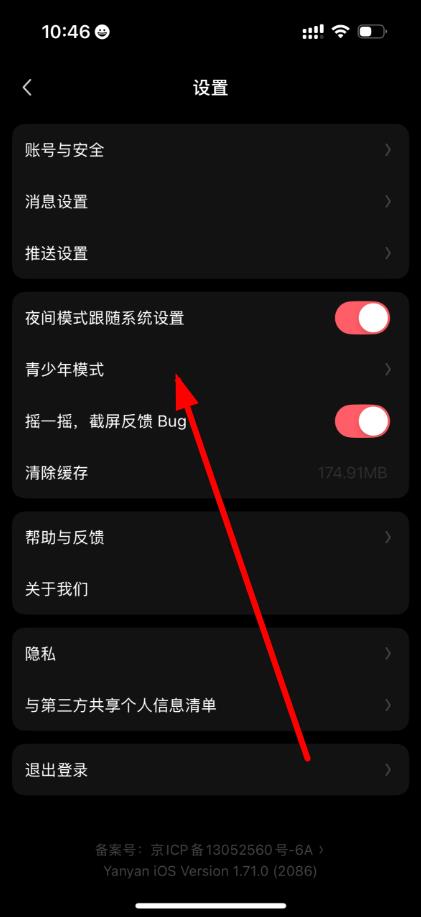 3、進入設置頁面后,可按需進行賬號與安全、消息設置、推送設置等相關操作,還能開啟或關閉夜間模式、青少年模式等功能。