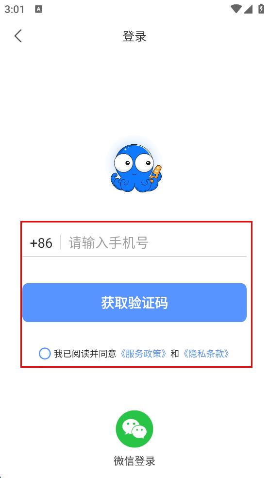2、進(jìn)入登錄界面,輸入手機(jī)號(hào),勾選同意服務(wù)政策和隱私條款,點(diǎn)擊獲取驗(yàn)證碼。