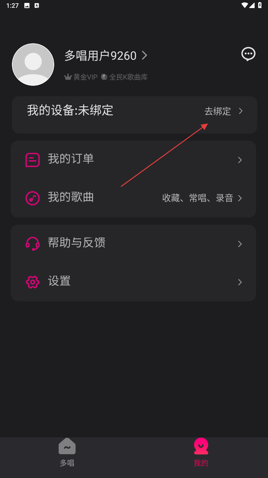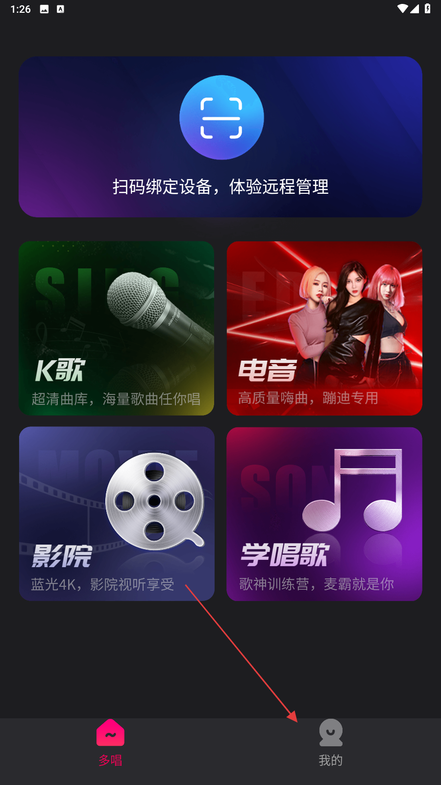 1、啟動(dòng)多唱APP,進(jìn)入到首頁內(nèi),點(diǎn)擊下方我的圖標(biāo)。