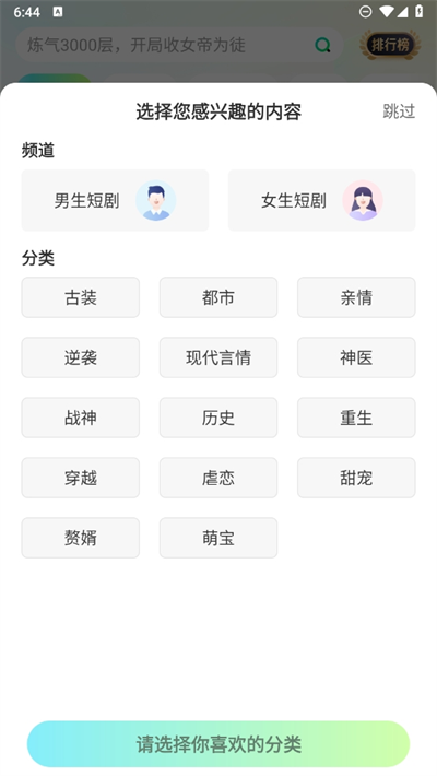 1、進(jìn)入短視頻的時(shí)會(huì)根據(jù)自己的喜好選擇感興趣的內(nèi)容,也可以選擇直接跳過有更多的類型選擇;