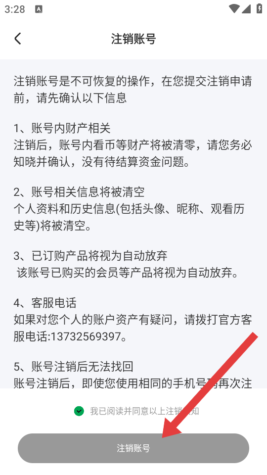 4、在注銷賬號(hào)頁面,勾選注銷須知,然后點(diǎn)擊底部的注銷賬號(hào)按鈕,完成賬號(hào)注銷。