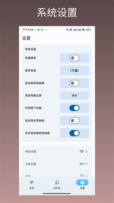 首頁(yè)新增三個(gè)快捷操作,分別是同步剪貼板、待發(fā)文件箱、設(shè)置