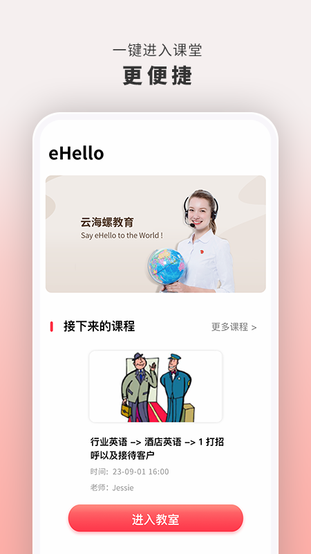 1、一鍵進(jìn)入:簡(jiǎn)單的點(diǎn)擊,即可進(jìn)入云海螺在線1對(duì)1app,便捷高效地開始的英語(yǔ)口語(yǔ)培訓(xùn)之旅;