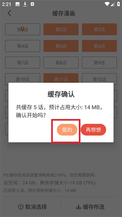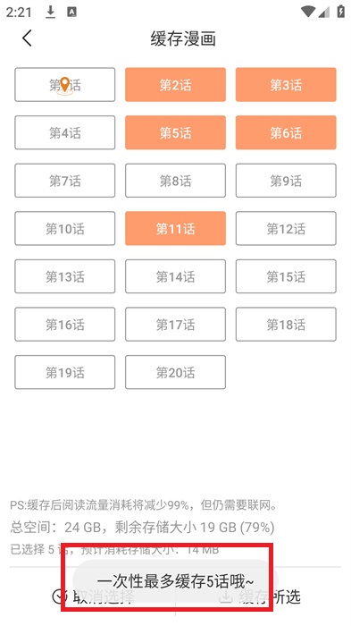 4、但是需要注意的是每次的緩存數(shù)量都會(huì)有限制,比如限制一次緩存5集,選擇好緩存的集數(shù)之后就可以點(diǎn)擊右下角的【緩存所選】去進(jìn)行緩存;