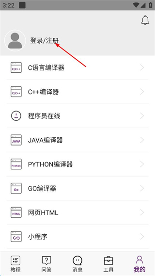 2、在個(gè)人中心界面,點(diǎn)擊“登錄/注冊”選項(xiàng),進(jìn)入登錄注冊選擇界面。