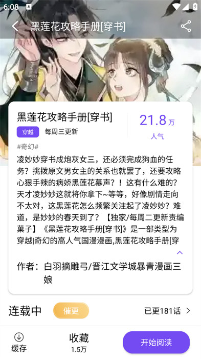 2、點(diǎn)擊自己想要閱讀的漫畫資源之后就會呈現(xiàn)出詳細(xì)的漫畫簡介內(nèi)容;