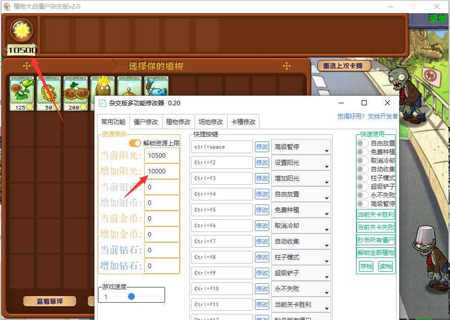 3、進(jìn)入關(guān)卡后,在修改器界面修改自己想要修改的數(shù)據(jù),比如陽(yáng)光,設(shè)定為增加10000后,按“enter”鍵確認(rèn),就可以看到游戲中陽(yáng)光變成10500了。
