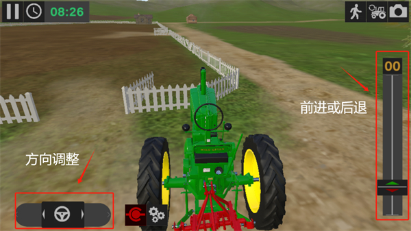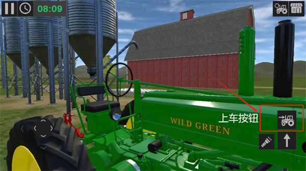 3、可以點(diǎn)擊下圖中標(biāo)記的上車按鈕進(jìn)行上車,以快速的開啟自己的駕駛農(nóng)用機(jī)之旅;