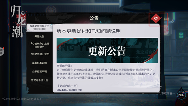 1、進(jìn)入到游戲的場景內(nèi)之后,將會出現(xiàn)一個(gè)游戲公告頁面,這個(gè)頁面內(nèi)有著多種不同的活動(dòng)信息,點(diǎn)擊屏幕右上方的紅色按鈕可以進(jìn)行關(guān)閉;