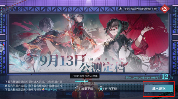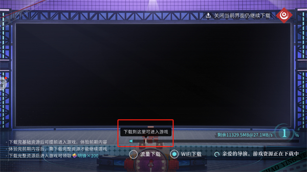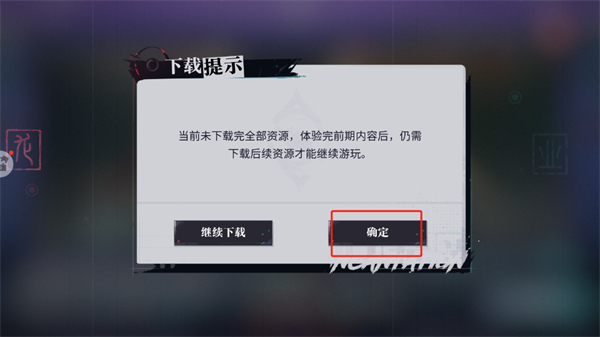 4、此時(shí)進(jìn)入游戲?qū)霈F(xiàn)一個(gè)提示頁面,玩家可以選擇繼續(xù)下載,也可以選擇進(jìn)入到游戲之中。