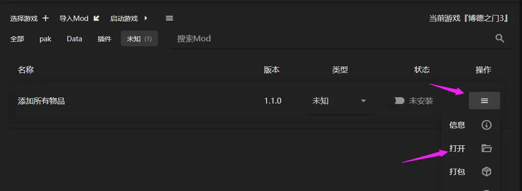 1、當(dāng)mod的類型在安裝時(shí)出現(xiàn)未知,可以找到mod列表下最右邊的操作下拉框中選擇打開(kāi)找尋mod目錄;