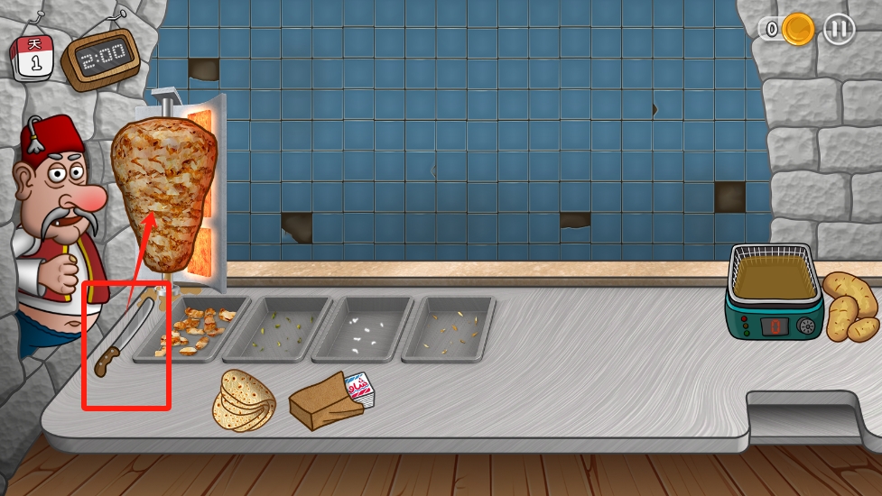 2、然后再點(diǎn)擊老人會(huì)拿出酸黃瓜和醬料,點(diǎn)擊黃瓜和蘸料放入盤(pán)中;