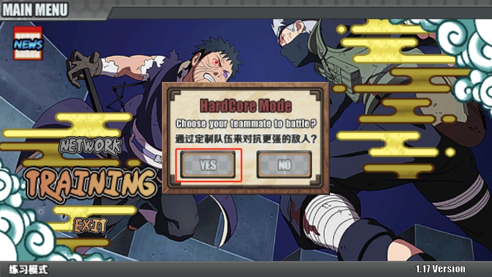 3、進入練習(xí)模式之后會有一個彈窗問題詢問你,根據(jù)當前想要戰(zhàn)斗的內(nèi)容進行選擇,點擊【YES】選擇火影英雄定制應(yīng)對英雄對抗敵人;