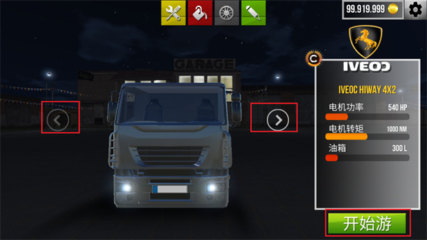 2、此時(shí)玩家將需要進(jìn)行卡車的選擇,選擇好自己喜歡的卡車后,需要點(diǎn)擊屏幕右下角的綠色小按鈕,以開啟駕駛之旅;